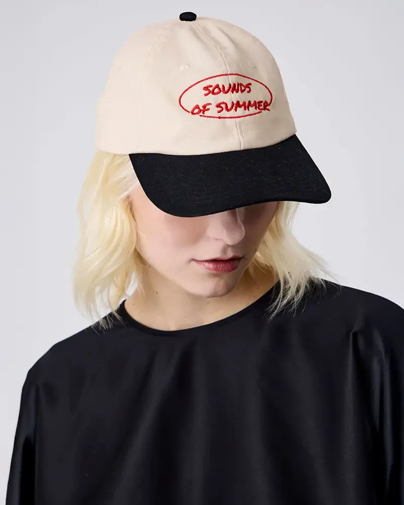boné sandra moodies & nk bicolor com bordado "sounds of summer" na frente e logo nk bordado na parte de trás. o acessório conta com fecho de fivela ajustável.