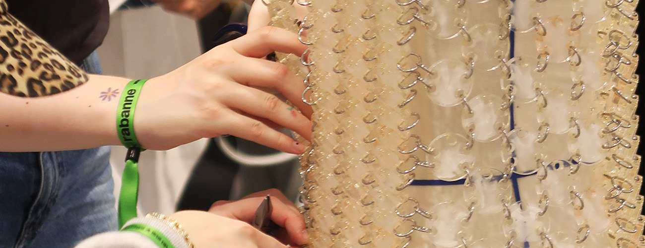 Nossa equipe acompanhou o desfile e os bastidores da coleção Spring/Summer 2025 de Rabanne. O evento provocou uma reflexão sobre a radicalidade. Sob a direção criativa de Julien Dossena, a coleção questiona a ideia de que a radicalidade nem sempre é revolucionária e instantaneamente óbvia, apresentando peças que combinam cotidiano e sofisticação, trazendo a energia conhecida de Rabanne, oferecendo um espetáculo deslumbrante, mas também ancorado na compreensão profunda do dia a dia das mulheres modernas. O desfile abriu com um look tão elegante quanto acessível, uma camiseta desconstruída, shorts jeans e sapatos lilás, envolvidos em plástico. Material que reapareceu ao longo do desfile, cobrindo acessórios e bolsas mais extravagantes, porém deixando brilhar a icônica Nano, feita de malha de ouro 18k. As peças, que variaram de blazers elegantes a jeans desconstruídos, foram adornadas com brilhos e texturas, como um suéter verde menta com detalhes metálicos e um vestido curto com apliques florais prateados.